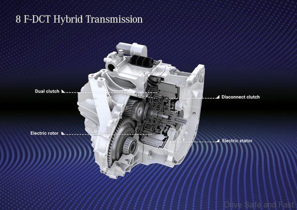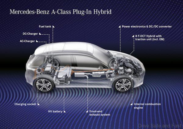 As these are smaller Benzes, they feature transversely mounted engines. As such, a compact hybrid traction head was developed for use with the 8F-DCT dual-clutch automatic. They operate on the same principle as the longitudinally mounted Benz PHEVs.