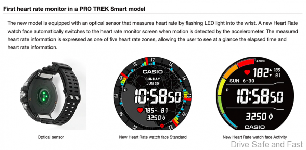 In addition, it comes with a new Heart Rate watch face. Using an accelerometer, the WSD-F21HR automatically switches to the heart rate monitor screen when motion is detected. The heart rate information is expressed as five heart rate zones,*2 allowing the user to see this data at a glance.