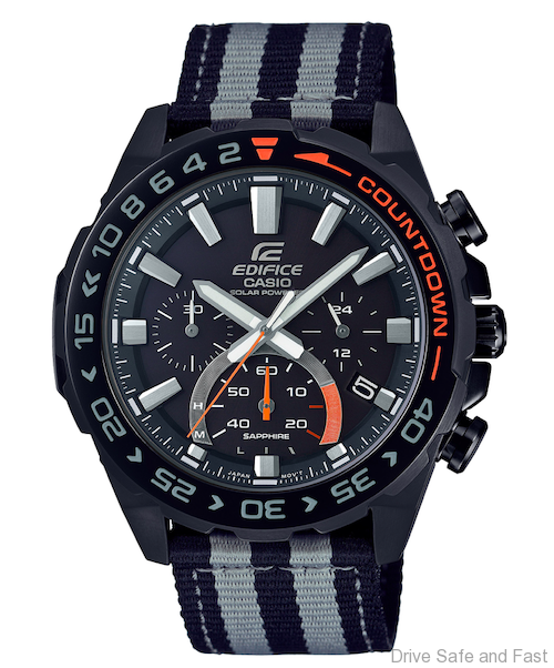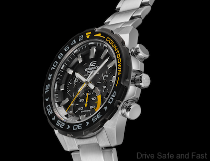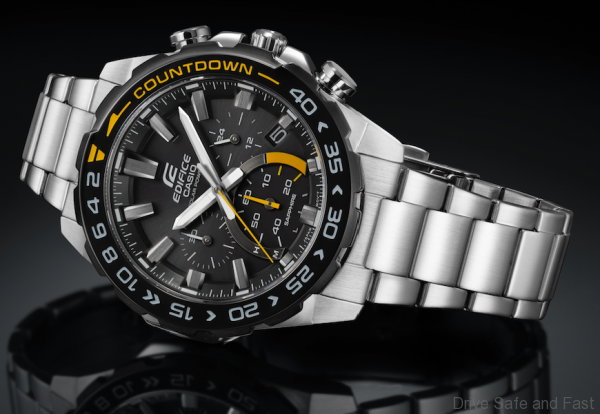 The new EFS-S550 is distinguished by a bold countdown bezel designed to be used by pit crews during races. The numbered bezel provides a countdown to the target time, enabling an intuitive grasp of the remaining time to facilitate team operations. The glass is made from scratch-resistant sapphire crystal to deliver the maximum visibility that is critical in racing situations.