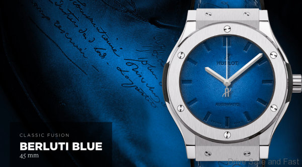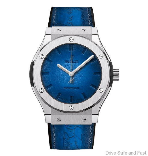 The Hublot Classic Fusion Berluti is available in three versions. The Blue features, as the name already indicates, a blue leather Berluti dial, combined with a strap made from patinated Venezia leather with Gaspard decor.