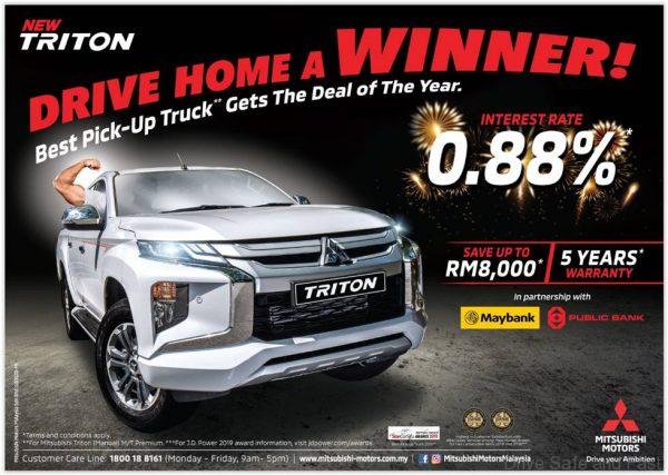 Mitsubishi Motors Malaysia has partnered up with Maybank and Public Bank for great low-interest-rate loans until the end of 2019. Purchase selected Triton models through Maybank or Public Bank hire purchase and you could enjoy an interest rate as low as 0.88%!