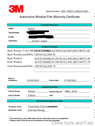 The price for a MPV this size with the best 3M has to offer was just RM2,800.00 with a 5-year factory warranty.