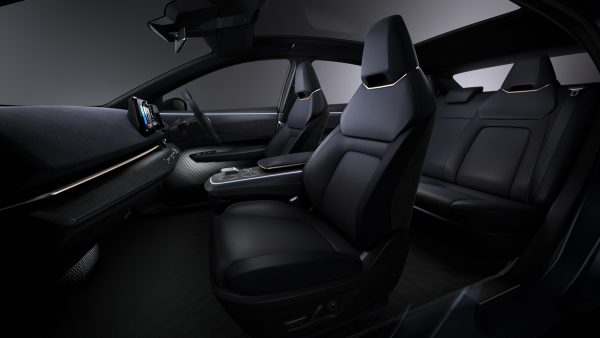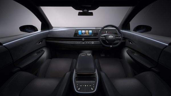 While the Ariya Concept’s exterior mainly expresses the ideas of “sleek” and “sexy,” the interior reflects a notion of seamlessness. There is a minimalist dashboard, along with the start button, a single knob to operate the 12.3-inch display monitor, and the climate controls as the only physical controls.