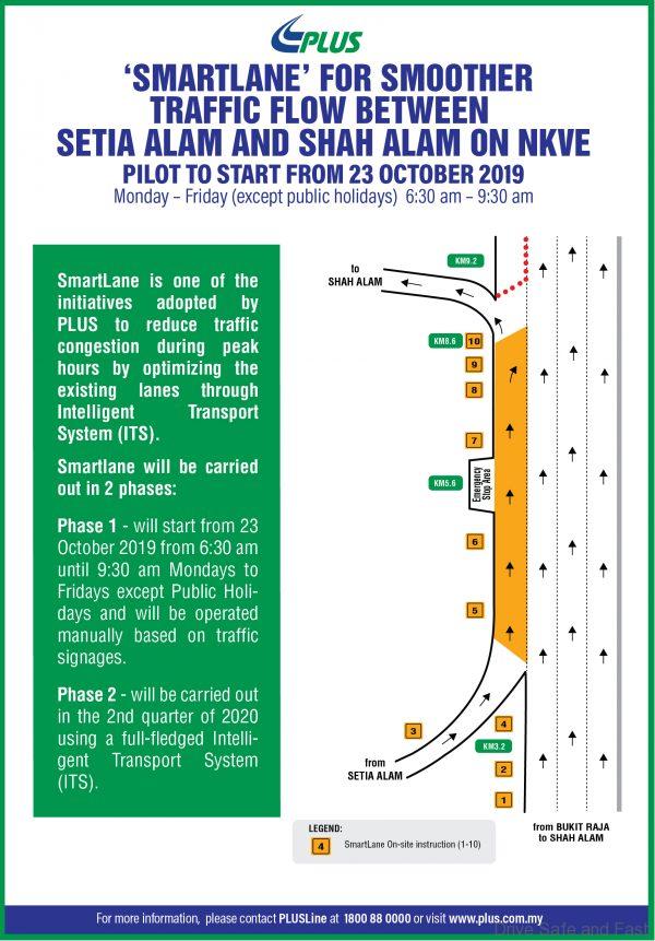 Effective October 23rd 2019, PLUS Malaysia Berhad (PLUS) plans to initiate a manual pilot SmartLane initiative to mitigate and evaluate the traffic congestion flow between Setia Alam exit towards the Shah Alam Toll Plaza.