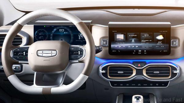 The minimalistic exterior design continues into the interior. By subtracting and simplifying the interior, more space was created, balancing form and function. The dashboard is dominated by two big screens, an information panel and central infotainment panel. From the dual interactive screens, users can interact with the vehicle and connect to the rest of the world through the use of the GKUI Geely Smart Ecosystem.