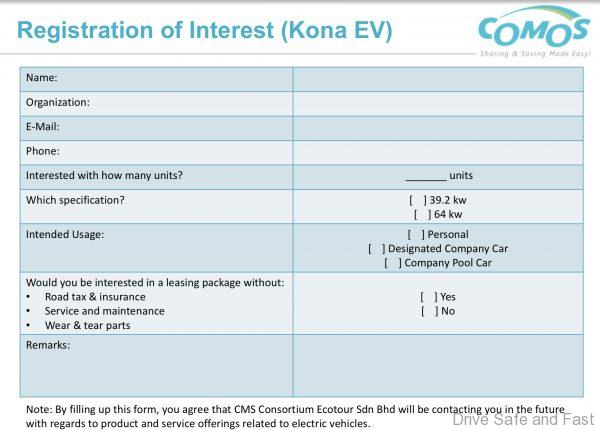 Earlier today, we received a peculiar little pdf form indicating that COMOS Malaysia was surveying the market to gauge local interest in the all-electric variant of the Hyundai Kona. The pdf particularly highlighted a leasing package that would be put together by COMOS Malaysia with no official support from Hyundai-Sime Darby Motors (HSDM). This was later confirmed by top level brass at HSDM. These would most likely be purchased directly from Korea or perhaps as gray units from the UK. Demand for the Kona Electric is so high there that you have to be put on a waiting list.