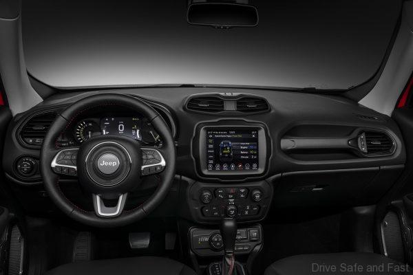 The Jeep Renegade PHEV features a unique interior and dashboard, plus an 8.4″ HD Uconnect system with specific pages to allow for the driver to control its day-to-day hybrid driving operation. The Selec-Terrain maintains its location in front of the gear shift lever, while the Hybrid selector appears right next to it allowing the driver to select between the following driving modes: