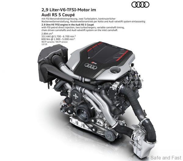 Immense tractive power and a high output combined with efficiency: The 2.9 TFSI twin-turbo V6, the heart of the RS5 models, outputs an unchanged 331 kW (450 PS) and already delivers a whopping 600 Nm (442.5 lb-ft) of torque as from a speed of 1,900 rpm. Both RS5 models accelerate from zero to 100 km/h (62.1 mph) in 3.9 seconds and reach a top speed of up to 280 km/h (174.0 mph) upon request.