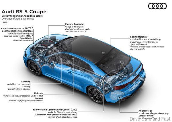 The two Audi RS5 models are fitted as standard with a taut RS sport suspension. The RS sport suspension plus with the Dynamic Ride Control (DRC) hydraulic roll and pitch stabilization is available as an option. It uses steel springs and three-stage adjustable dampers that are connected to one another via diagonal oil lines and a central valve. When cornering at speed, the valves regulate the oil flow in the damper of the spring-deflected front wheel at the outside of the curve. They reinforce the support and reduce pitching and rolling, thereby improving the vehicle’s handling characteristics.