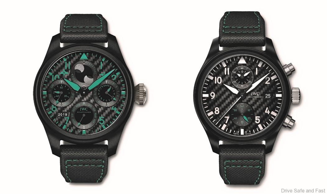 PRESS RELEASE: The special editions feature a matte black zirconium oxide ceramic case and a carbon fibre dial – both high-tech materials, used also in the premium class models such as the Mercedes-AMG F1 W10 EQ Power+. The striking black design with PETRONAS Emerald Green accents was inspired by the team colours of the six-time world champion and IWC partner.