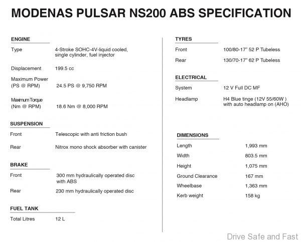 Apart from the additional safety feature, the NS200 ABS retains the 200cc, single-cylinder DTS-i engine that makes 18 kW (24 hp) and 18.6 Nm of torque.