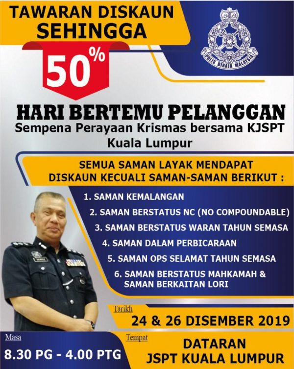In the spirit of giving, Polis Diraja Malaysia (PDRM) are giving discounts of up to 50% on select summons. Most traffic summons will be eligible for a discount except the ones listed below: