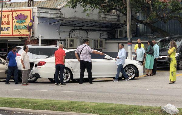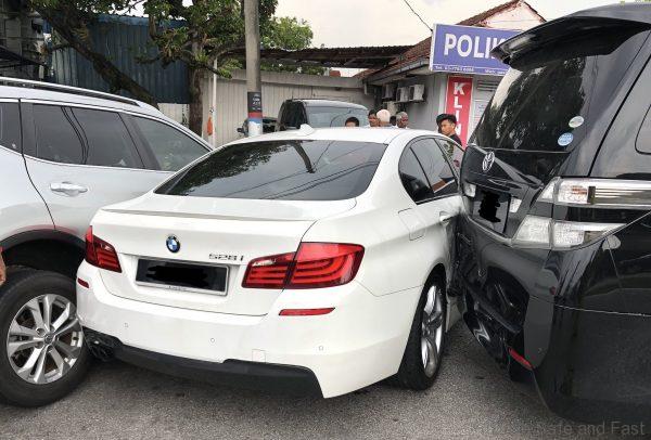 Sadly, this was not so. Before the tow hook could be hooked up to the Alphard, the gear shifter went into neutral and the hand brake was released. Oops, the Alphard rolled back and rammed into the side of the white BMW 5 Series which pushed the BMW to ‘smooch’ the Nissan X-Trail’s whole right side.