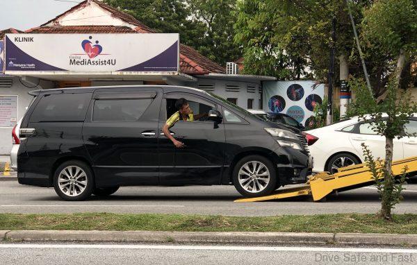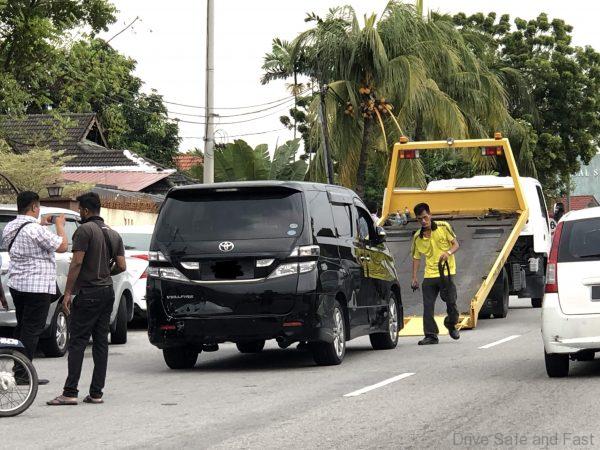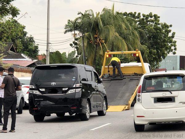 From the information we gathered at the accident location, the Toyota Alphard had an engine issue. The owner called for a tow truck. The tow truck arrived and the operator lowered the rear bed to pull the Toyota Alphard up. To pull the Alphard up the handbrake had to be released and the gearbox had to be in neutral….and this should have been done AFTER the tow hook had been connected to the front of the Alphard.