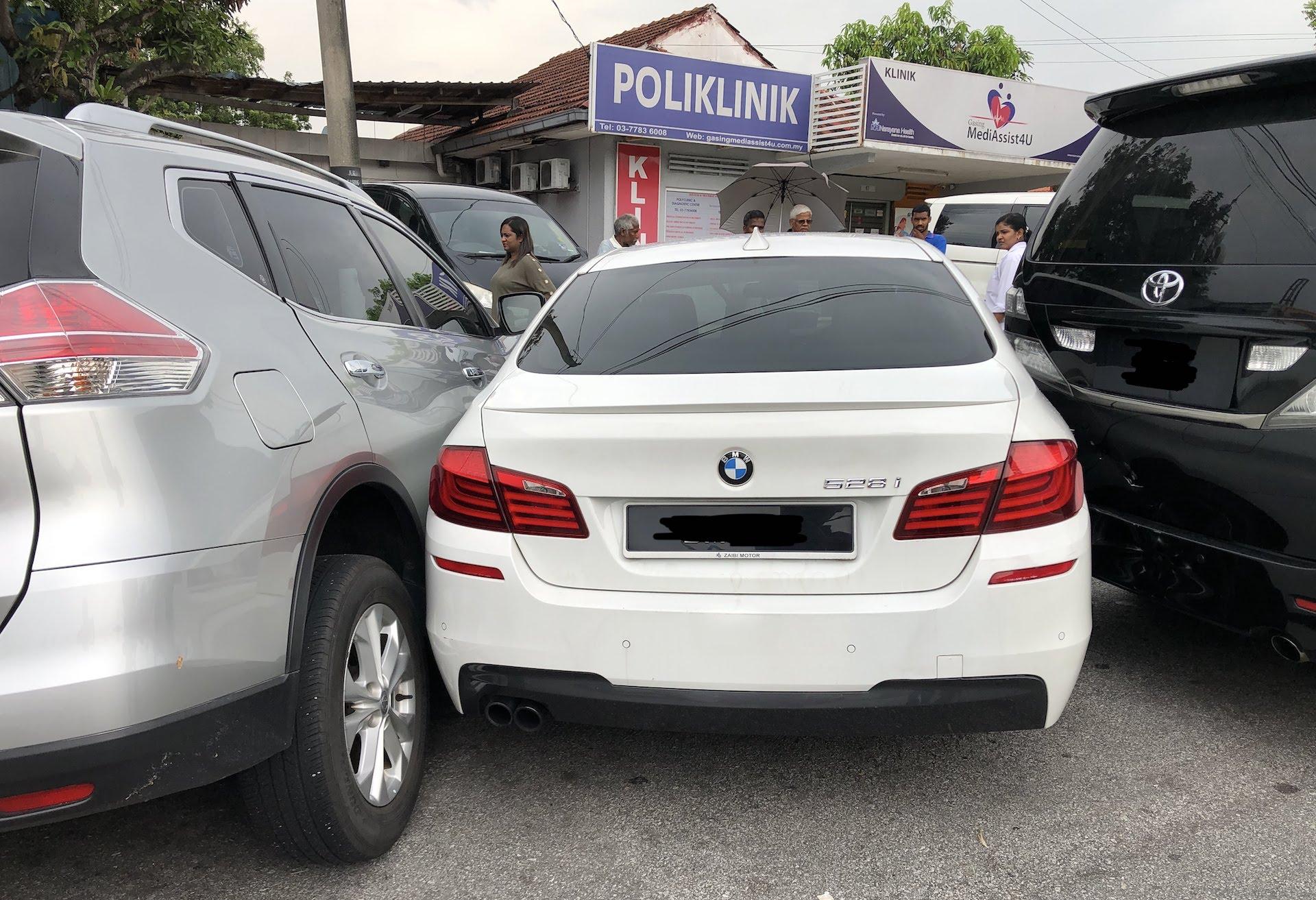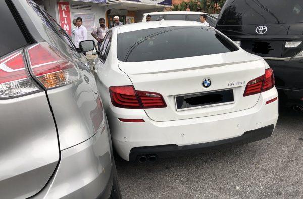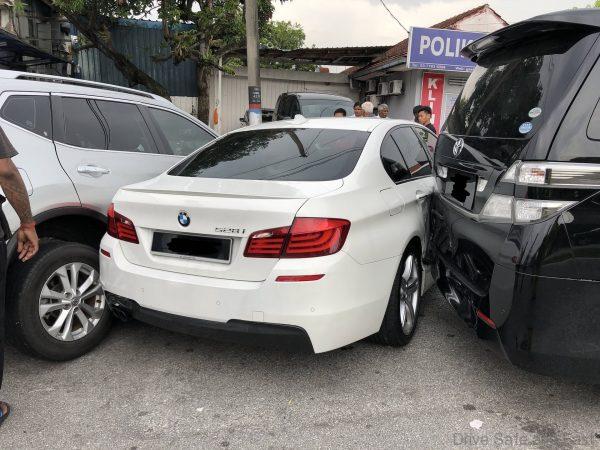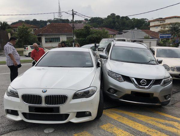 Sadly, this was not so. Before the tow hook could be hooked up to the Alphard, the gear shifter went into neutral and the hand brake was released. Oops, the Alphard rolled back and rammed into the side of the white BMW 5 Series which pushed the BMW to ‘smooch’ the Nissan X-Trail’s whole right side.