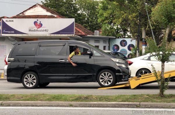 From the information we gathered at the accident location, the Toyota Alphard had an engine issue. The owner called for a tow truck. The tow truck arrived and the operator lowered the rear bed to pull the Toyota Alphard up. To pull the Alphard up the handbrake had to be released and the gearbox had to be in neutral….and this should have been done AFTER the tow hook had been connected to the front of the Alphard.