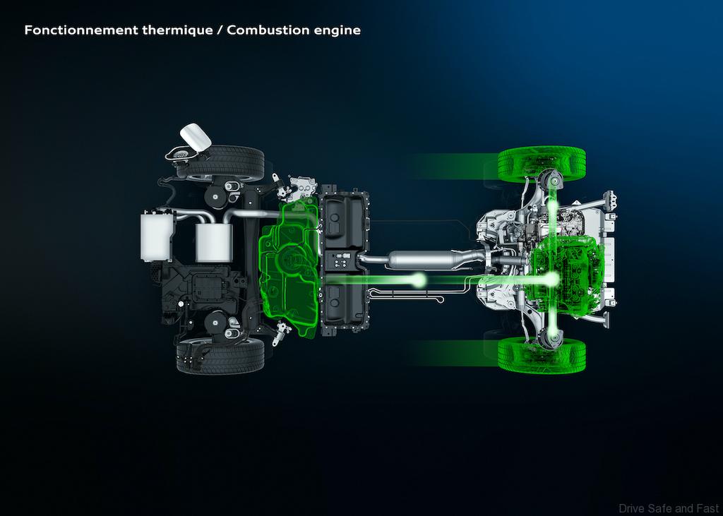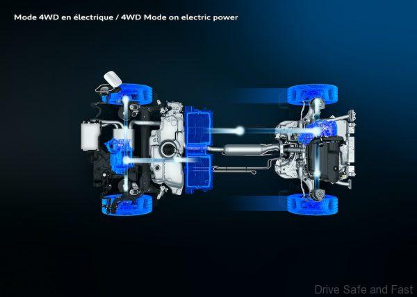 An electric motor is linked to the box and reaches 110hp/80kW on the front suspension.