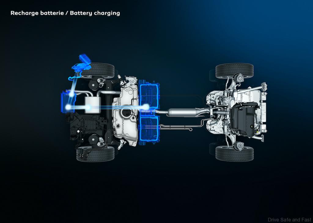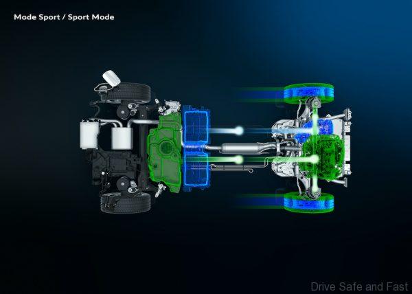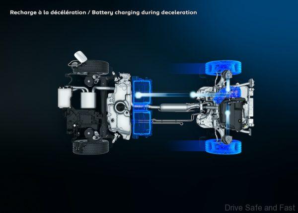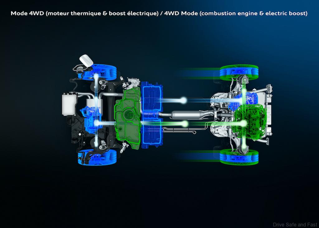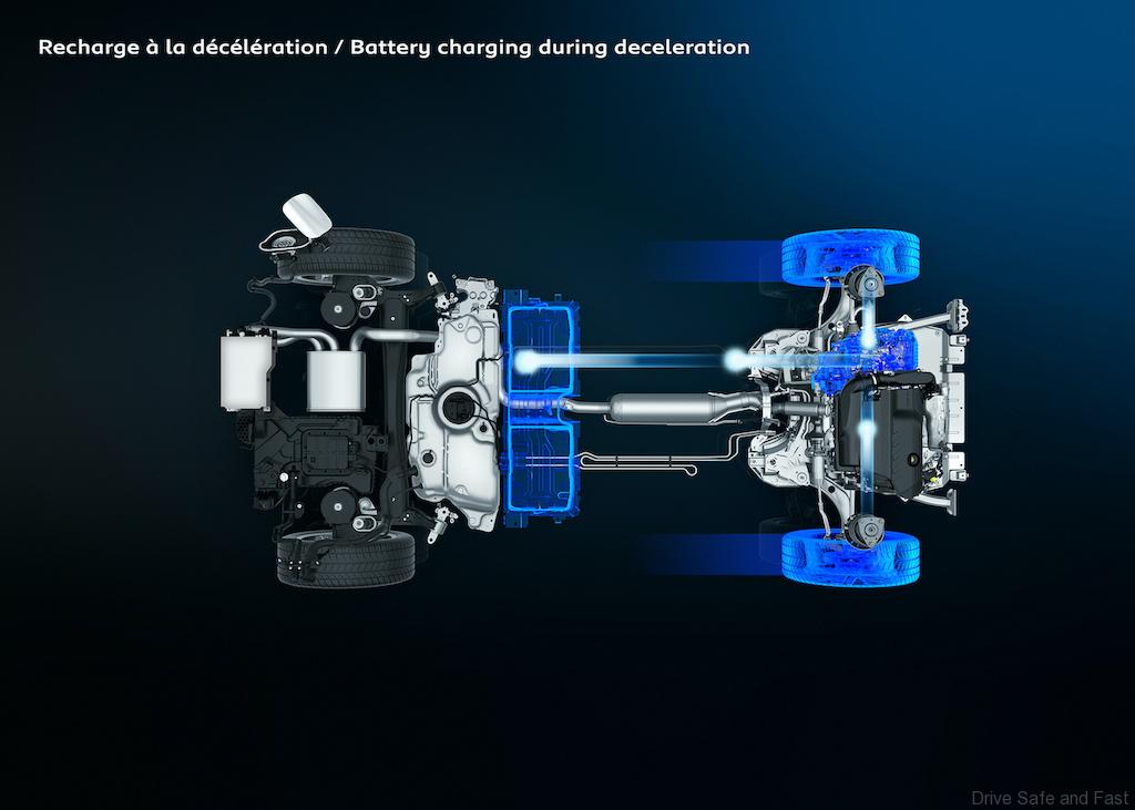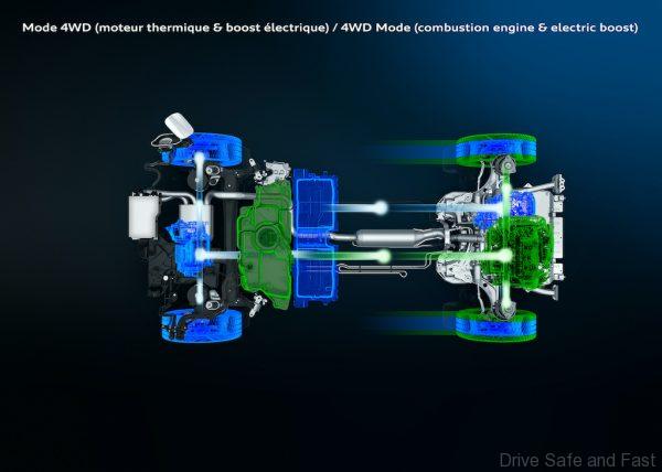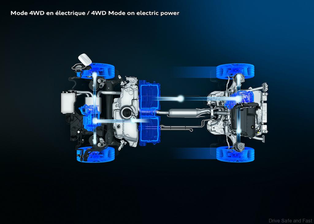 The Hybrid4 powertrain consists of three motors: a 200hp 1.6L PureTech petrol engine, one 110hp electric motor at the front axle, mounted to a new, electrified e-EAT8 transmission, and another 112hp electric motor matched to the rear axle.