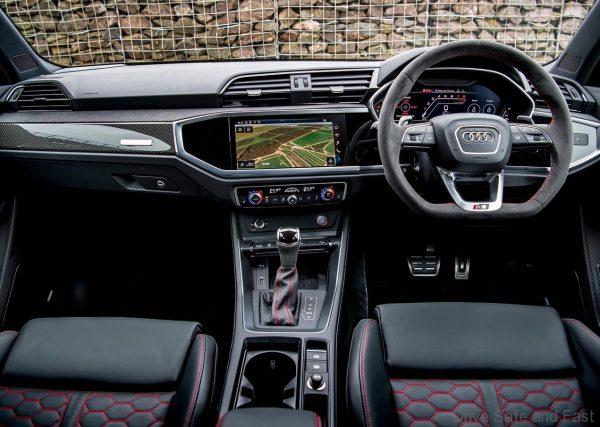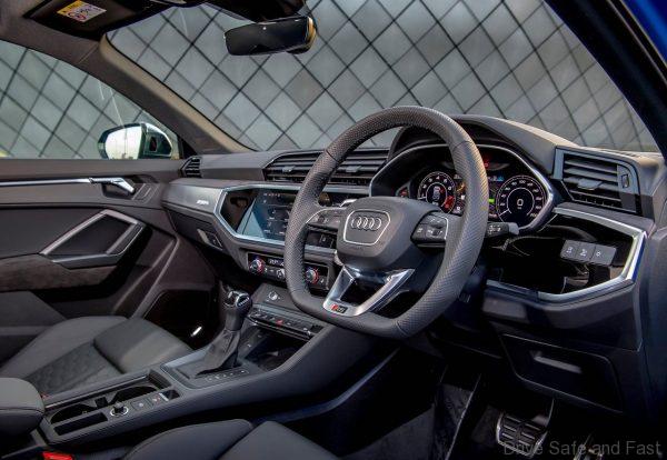 The new Audi RS Q3 and RS Q3 Sportback are designed as fully fledged five-seater models and also offer maximum everyday usability for all their sportiness. The rear seats can be moved fore-aft as standard by 150 millimeters (5.9 in) in the RS Q3 or 130 millimeters (5.1 in) in the RS Q3 Sportback; their three-way split backrests can be tilted in seven stages. The luggage compartment holds 530 liters (18.7 cu ft), with the backrests folded down the figure rises to 1,525 liters (53.9 cu ft) (Sportback: 1,400 liters (49.4 cu ft)).