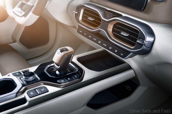 Inside the ICON, the minimalistic analog-inspired design helps give the cabin a futuristic sci-fi feel. The symbol of time is once again visually present in the design form of the air vents and central console. Dual interactive 10.25 inch screens, an information panel and central infotainment console dominate the dashboard. From the two interiors screens and mobile devices, users can interact with ICON and connect to the world through the GKUI Geely Smart Ecosystem.