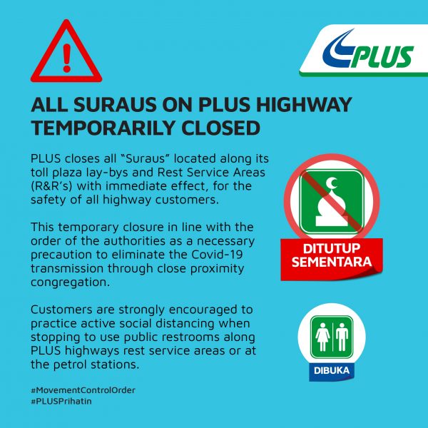All suraus located along PLUS toll plaza lay-bys and Rest Service Areas (R&R’s) will be closed with immediate effect for the safety of all highway customers.