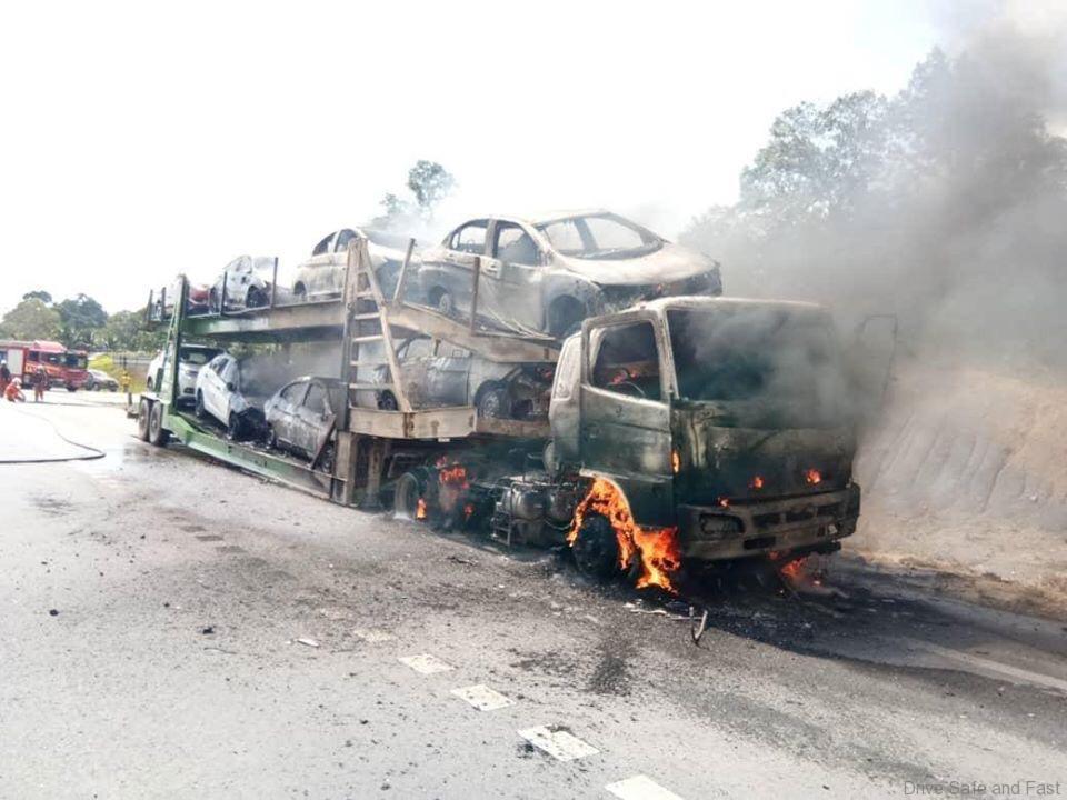 It is unclear if the HR-Vs at the end of the trailer survived the fire, but news sources quote all 8 cars as being damaged by the fire. Not counting the cost of the truck and the wasted freight charges of shipping the cars from Peninsular Malaysia, roughly RM600,000 worth of cars were damaged or destroyed in that fire.