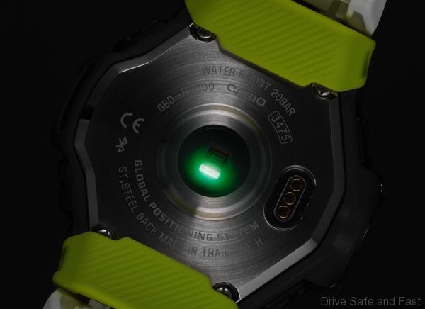 The exterior delivers a good fit and practicality and features a high-definition, memory-in-pixel (MIP) LCD with high-contrast, a bezel configuration that is easy to operate even without looking at the buttons, large non-slip buttons, a curved back cover that carefully considers the back of the hand, and a soft urethane band. In addition to USB charging, the watch offers solar charging for daily use such as the vibrating notification function. This G-SHOCK is optimal for everyday health monitoring and training.