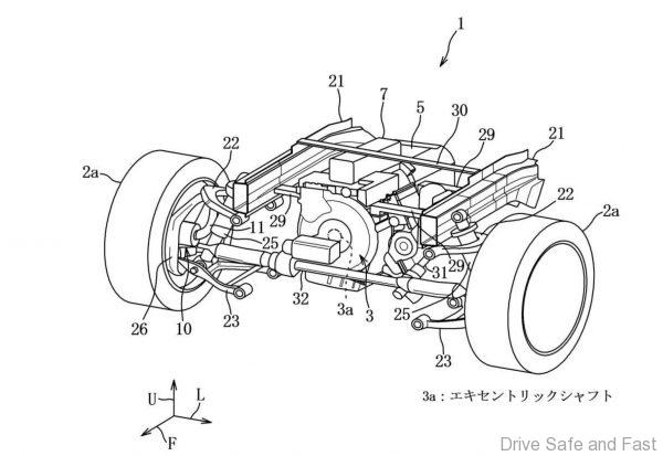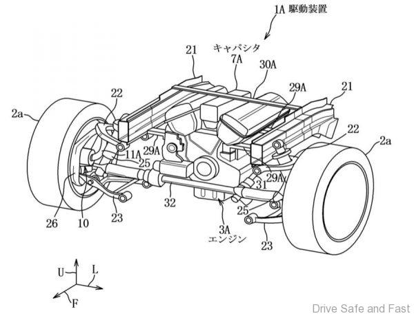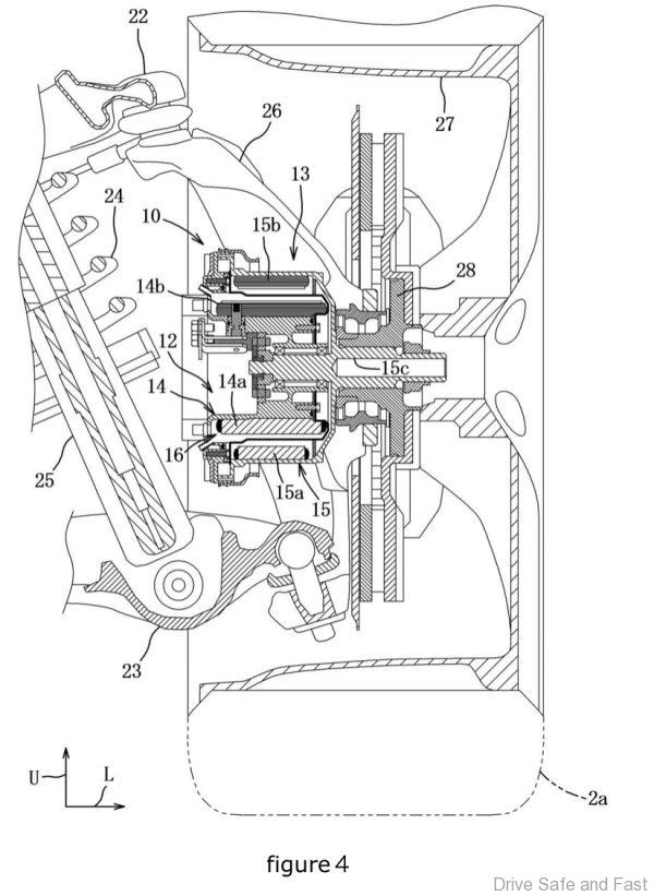 The patent revolves around a new all-wheel drive hybrid system with a combustion engine at the front, an electric motor at the rear, and another set of smaller electric motors in each of the front wheels. The system also integrates a rather small 3.5kWh lithium-ion battery and a capacitor. Energy recuperated from braking goes into the capacitor before charging the battery and the electric motors get their power from the capacitor first before trying the battery when the capacitor is “empty”.