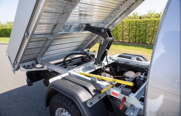 What’s fitted is a Tippadeck bed, which is made of 18mm alloy floor panels with 300mm high sideboards and a tailboard that opens up 180°, either from the top or bottom (it has two hinges).