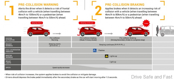 ASA works between 4 and 30 km/h. It uses stereo cameras that can recognise other vehicles in front of it. Pre-Collision Warning would have alerted the driver that she was coming up to quickly to the car in front, but that may not have helped. The next stage, Pre-Collision Braking may have mitigated the incident by first weakly engaging the brakes and then fully engaging them to bring the vehicle to a stop. Even if the car still ended up knocking into the other vehicle, its velocity would have been reduced and it probably would not have ended up finally crashing in to the police station.