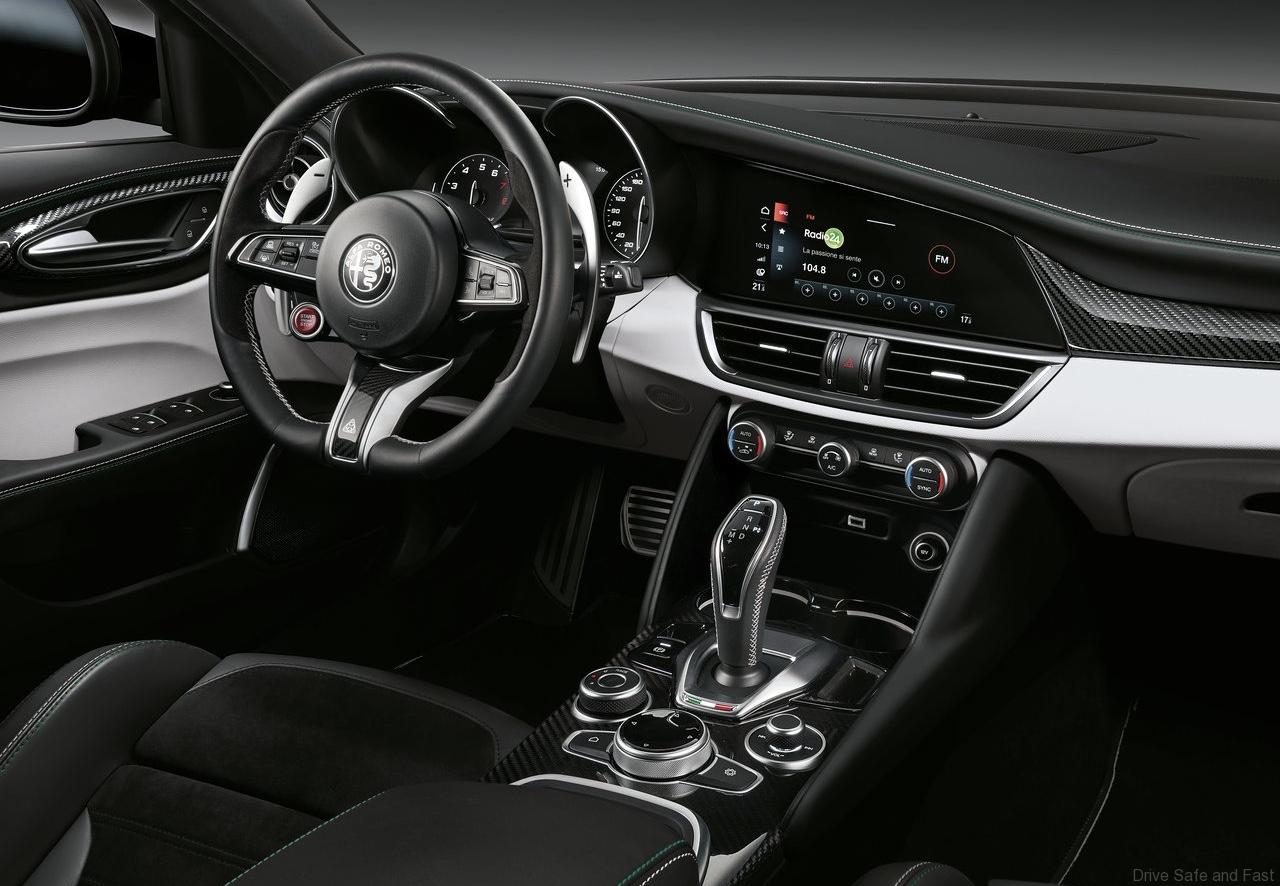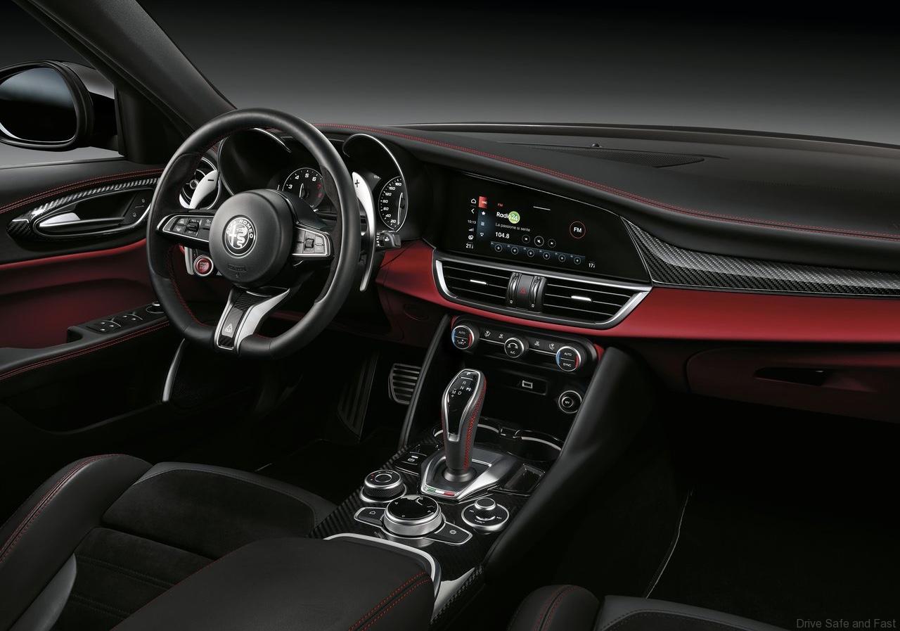 Coming soon, a new upholstery option for the electric sports seats, with perforated leather throughout. This new option expands the possibilities for customization of the Giulia and Stelvio Quadrifoglio, still fitted with sports seats with leather and Alcantara throughout, as always as standard in these versions. Sports seats with a carbon shell structure by Sparco are still available. The on-board technology includes an all-new infotainment system with 8.8” central touchscreen display, featuring connected services and a new interface design.