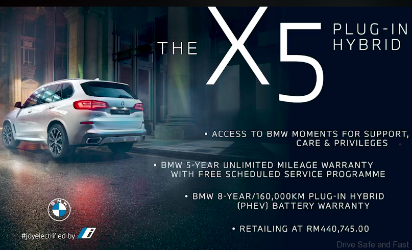 Here comes the all new BMW X5 Plug-in Hybrid (PHEV) at a selling price of RM440,745 with a strong 8-year or 160,000 kilometers plug-in hybrid battery warranty. There is also a 5-year unlimited mileage warranty with free scheduled service program to ensure Malaysian buyers a worry free ownership.