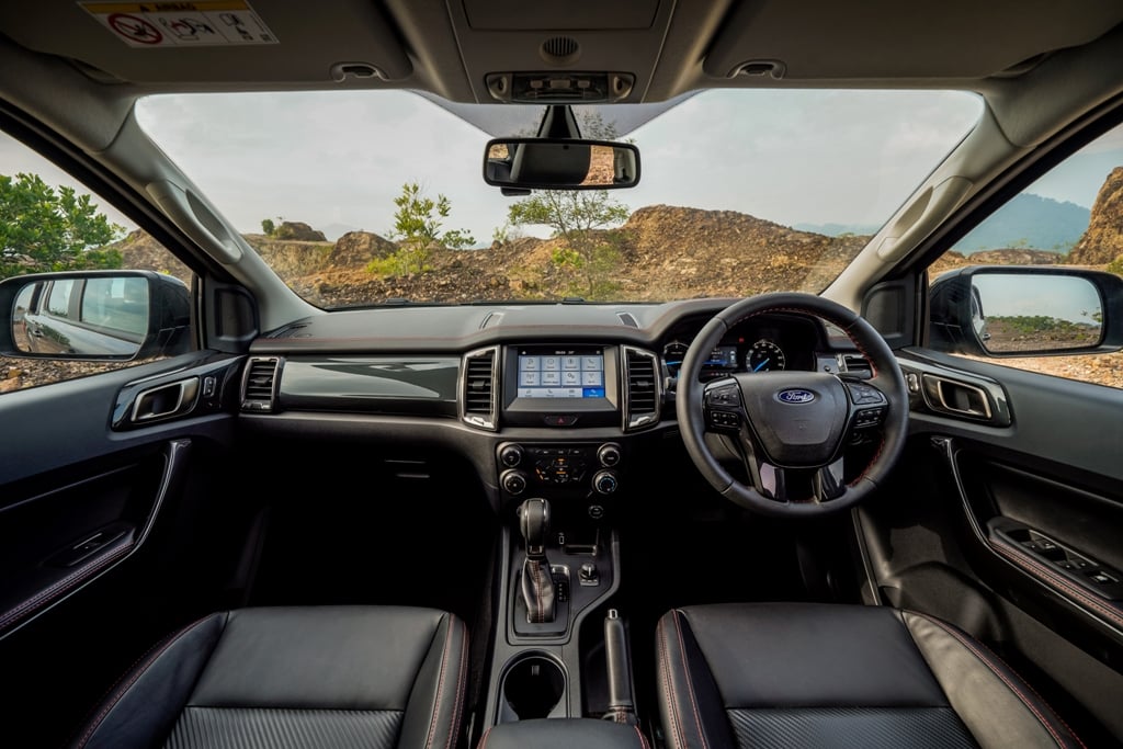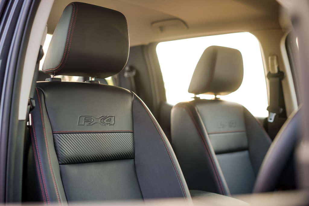 The strong FX4 identity continues inside the cabin with leather-accented seats that are embossed with the striking FX4 logos on the seatbacks. These complement the contrasting red stitching that has been applied to the gear selector, centre console, instrument panel, centre console, door trims, handbrake and the Ranger’s FX4 steering wheel. Special FX4-branded carpet mats finish its interior enhancements, retaining the Ranger’s premium and comfortable car-like interior.