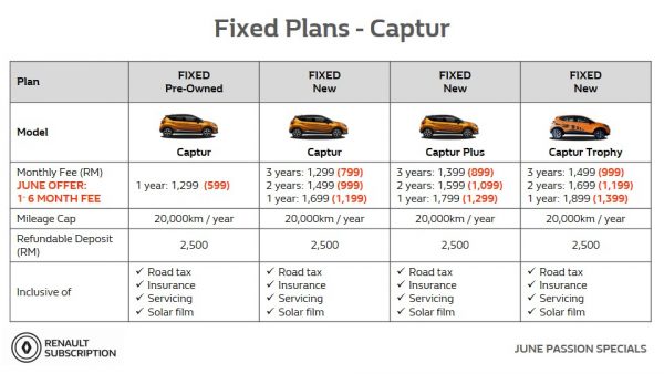 · Pre-Owned Captur Fixed and New Fixed Plans: RM200