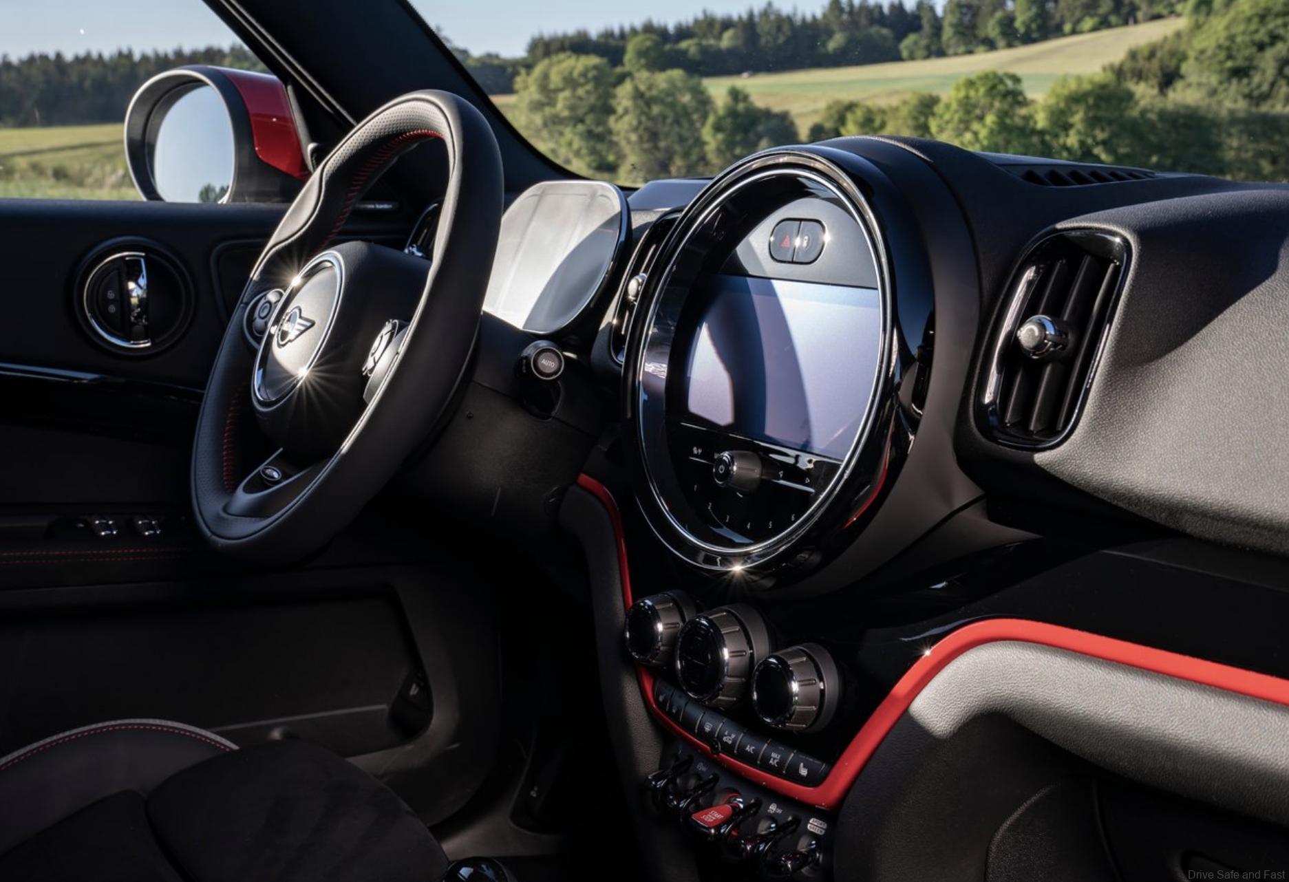 The interior also features new accents. The sports car flair of the new MINI John Cooper Works Countryman is now combined even more extensively with a modern premium ambience. The digital instrument display behind the steering wheel with a diameter of 5.0 inches is a new optional equipment component. The optional Connected Media equipment in the new MINI John Cooper Works Countryman also includes an 8.8-inch colour display with touchscreen function in the characteristic central instrument panel, which now features even higher quality design. In its new version, it has a bezel and touch-sensitive control panels with high-gloss Piano Black surfaces.