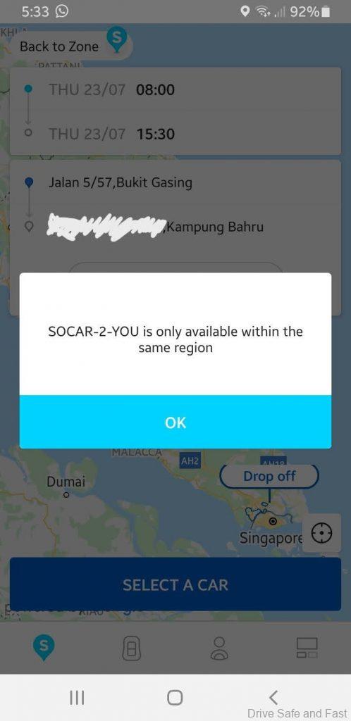 Apparently their ‘SOCAR-2-YOU’ Service isn’t meant for interstate travel! But here’s the odd part, I had no problem using that service to travel from JB to KL twice. I wasn’t deliberately trying to trick the app or anything. In fact, after I found out it wasn’t supposed to work, I immediately screen captured my process to show proof that it could be done easily. Here are the steps involved in text, and I’ve also attached a video below of my screen capture.