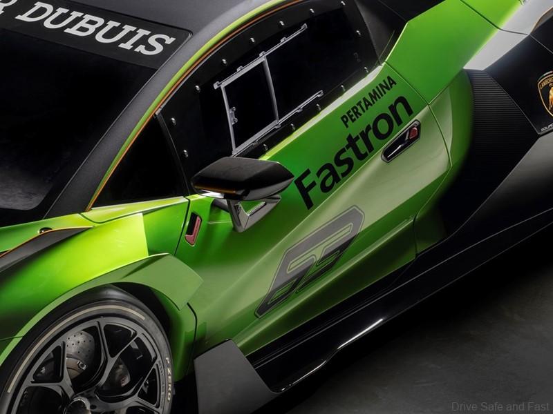 The front hood has a double air intake with a central rib, typical of the Huracán racing cars, which separates the hot airflow coming from the radiator and conveys the cold air to the airscoop located on the roof. The front features a splitter and two lateral elements; on the sides, the flows for engine and gearbox cooling have been optimized through the use of vertical fins situated on the side sills. The aerodynamic package is completed by the large adjustable double-profile rear wing.