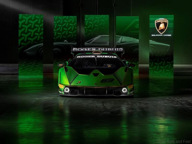 The sleek yet taut and dynamic lines combine the appeal of 1970s prototypes and elements typical of Lamborghini’s DNA, like the hexagonal geometry that characterizes the front headlights, and the roof airscoop and air vents that frame the steering wheel. There is also the unmistakable “Y”, the stylistic feature repeated on the livery and in the cockpit, where each element represents the best compromise between lightweight, functionality and design. In fact, the instrument panel and dashboard are supported by an asymmetrical carbon “Y”, a load-bearing and stylistic element that frames the cockpit, designed to put the driver at the center of an absolute driving experience.