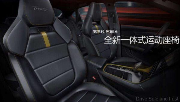 A flat-bottomed steering wheel with selectable driving modes is fitted on the MG 6. From the photos we’ve seen this MG 6 Trophy edition is available with yellow accents scattered throughout the cabin and ‘Trophy’ on the semi bucket seats.