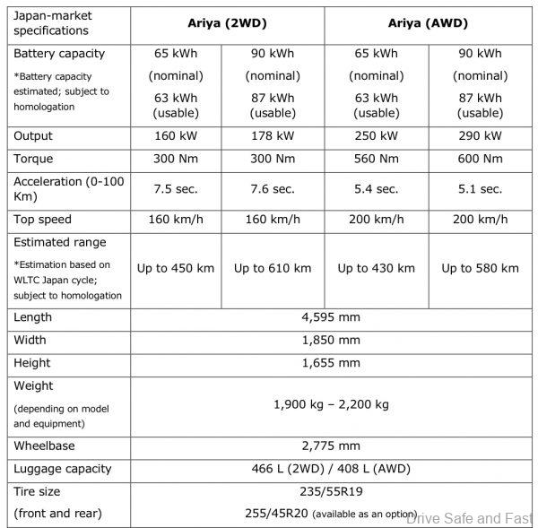 Four variants are planned for the Japanese domestic market. Customers get to choose between 65kWH and 90kWh batteries and between 2WD and AWD. Here’s how those combinations look like on paper.