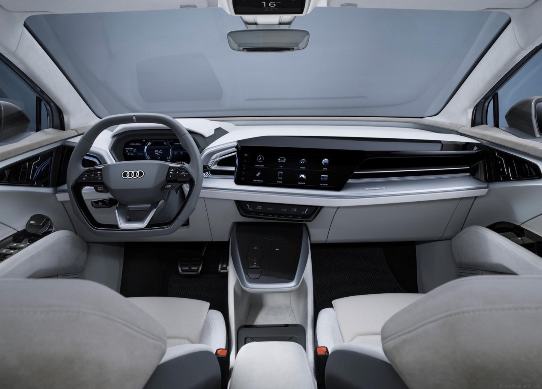 The color scheme emphasizes the sense of spaciousness. While light, warm colors dominate the upper section of the cabin, the dark carpet in the floor section provides a contrast. The headlining, the window pillars and the upper section of the door rail and dash panel are fitted with white and beige microfiber textiles. Sustainability is the top priority not only in terms of the electric drive in the Audi Q4 and Q4 Sportback: The floor covering is made of recycled materials. Instead of chrome-plated metal decor frames, the surfaces are covered with a high-quality multi-layer paint finish. The painted frosted Plexiglas on the applications creates an intensive depth effect. Four seats with integrated head restraints are upholstered with comfortable Alcantara material manufactured with exquisite workmanship. Double seams stitched with thick yarn adorn the upholstery.