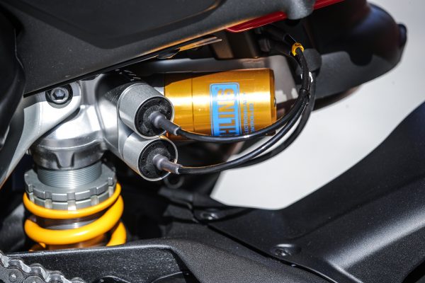 The Panigale V4 S 2020, comes standard with an Öhlins NIX-30 fork, an Öhlins TTX36 rear shock absorber and an Öhlins event-based steering damper. On this version suspension and steering damper are controlled by the second-generation Öhlins Smart EC 2.0 system which, among other things, features the new OBTi (Objective Based Tuning Interface). Included in the specifications of the Panigale V4 S is a lithium-ion battery, Marchesini forged aluminium wheels in total black as well as sports grips.