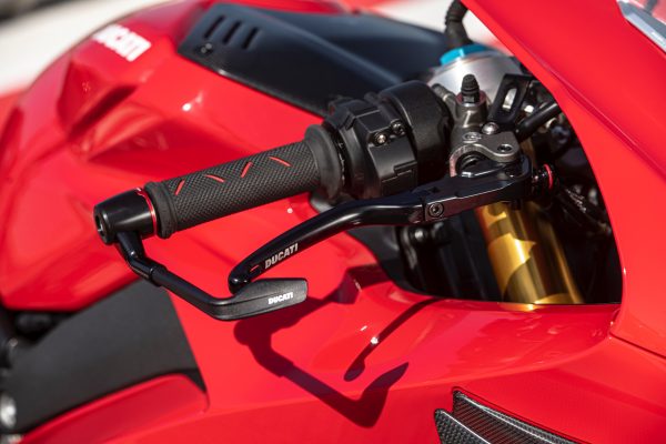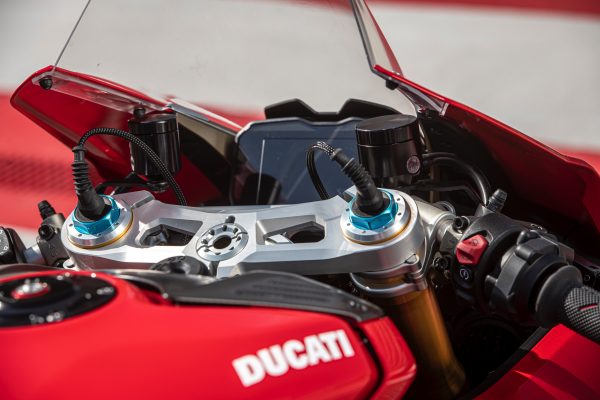 The Panigale V4 and Panigale V4 S models are now equipped with content adopted directly from the V4 R, starting with the aero pack (aerofoils, screen, nose fairing and larger lateral fairings which include side vents for radiator through-air having a higher efficiency). The aero pack provides better airflow protection for the rider and improves overall vehicle stability, thereby enhancing confidence.
