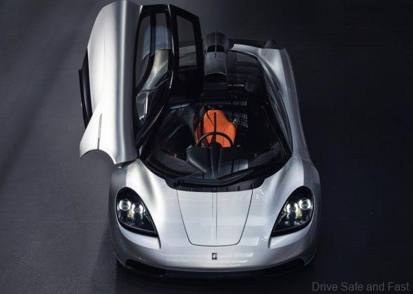 The purity of the silhouette is broken dramatically when the pair of dihedral doors rise up and forwards, coming to rest high above the passenger cabin. Inside, the driver-centric approach is plain to see – from the central, jet fighter-like driving position, to the aerospace-grade primary and secondary controls arranged in an ‘ergonomic bubble’ around the driver.