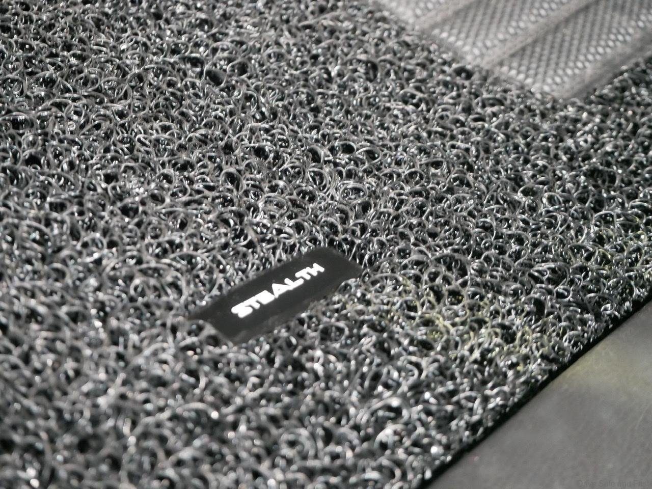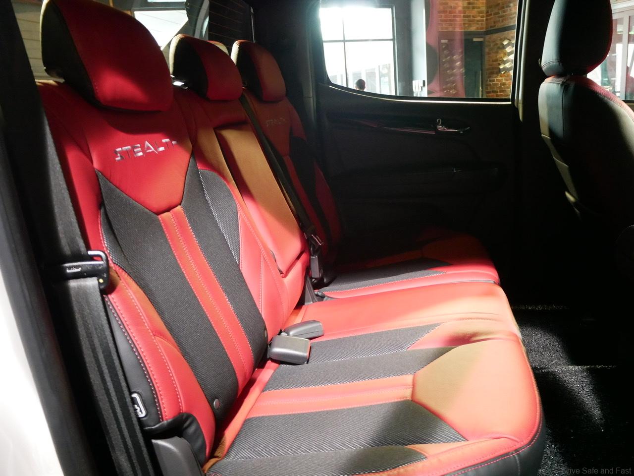 Inside, there are functional and aesthetic changes. The seats are covered in red and black leather and fabric with ‘Stealth’ logos stitched on. The pillars and headliner have been darkened, and trim pieces have been finished in piano black. The only bit of chrome you find are on the air vent knobs. Isuzu have also fitted coil mats with the ‘Stealth’ logo on it.