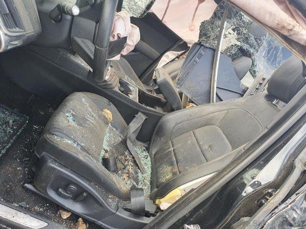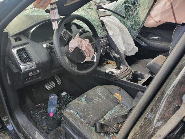 The result of this rollover incident is not pretty. Initial observations easily conclude that there is not a straight panel in sight on this black Jag. All airbags, including the side curtain airbags, have gone off. The windows and panoramic glass roof has shattered, showering glass everywhere. Even the section of roof above where the driver’s head should be has been buckled due to the force of the roll.