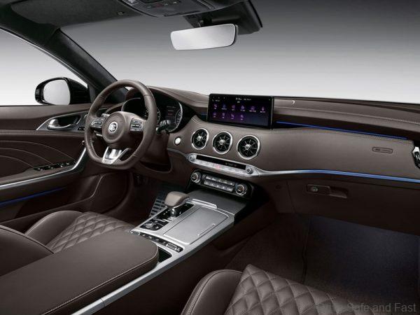 Depending on specification, the dashboard and doors are finished with new contrast stitching, while the center console is available with aluminum or carbon fiber-style trim; both measures enhance the sporty nature of the cabin. Sitting atop the dash is Kia’s upgraded 10.25-inch touchscreen infotainment and navigation system, accented by a new glossy black finish along the front of the dash. The cabin also features a new mood lighting system, allowing drivers to select one of 64 colors to subtly alter the character of the cabin.