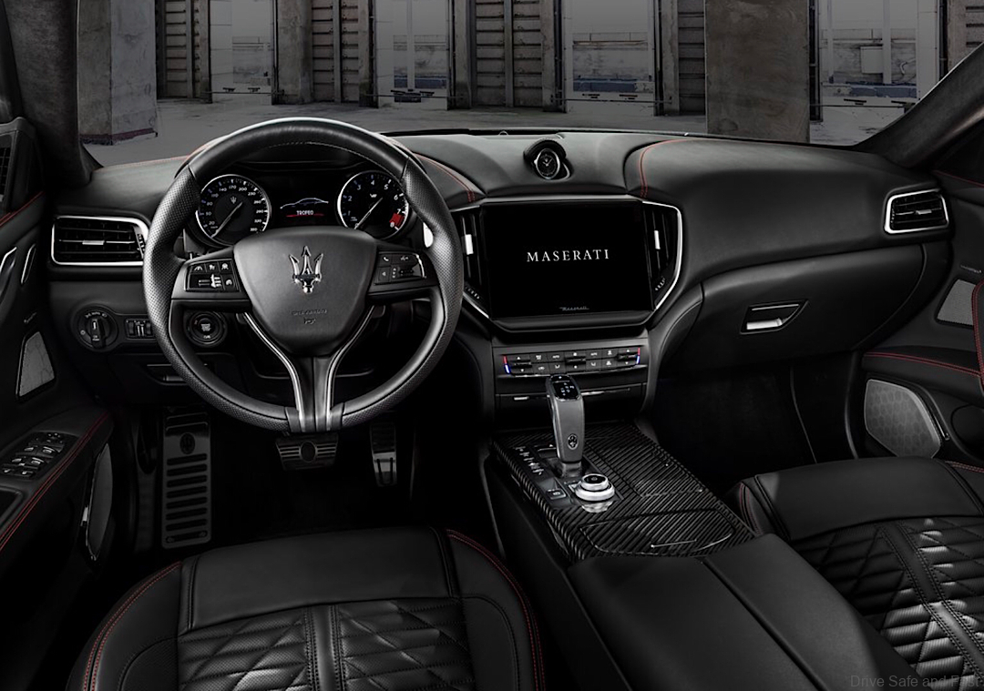 In terms of aesthetics, the Trofeo family has a distinctive look with red details, a lightning bolt on the C-Pillar mounted Trident badge. Inside, Trofeo badges on the headrests, full-grain Pieno Fiore natural leather and a new ob-board display panel. The Ghibli Trofeo gets a more aggressive hood, a-la the Levant Trofeo.