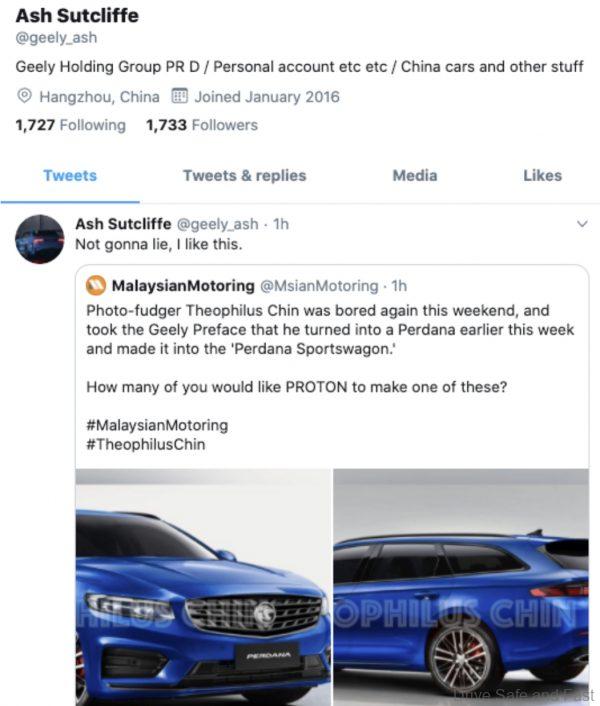 This body shape really suits the character of the Geely Preface and could be a hit. Proton however, have never really ventured into wagon territory. Nonetheless this ‘Perdana Sportswagon’ was interesting enough to get the attention of Geely’s own head of external Public Relations, who retweeted it on his personal account.