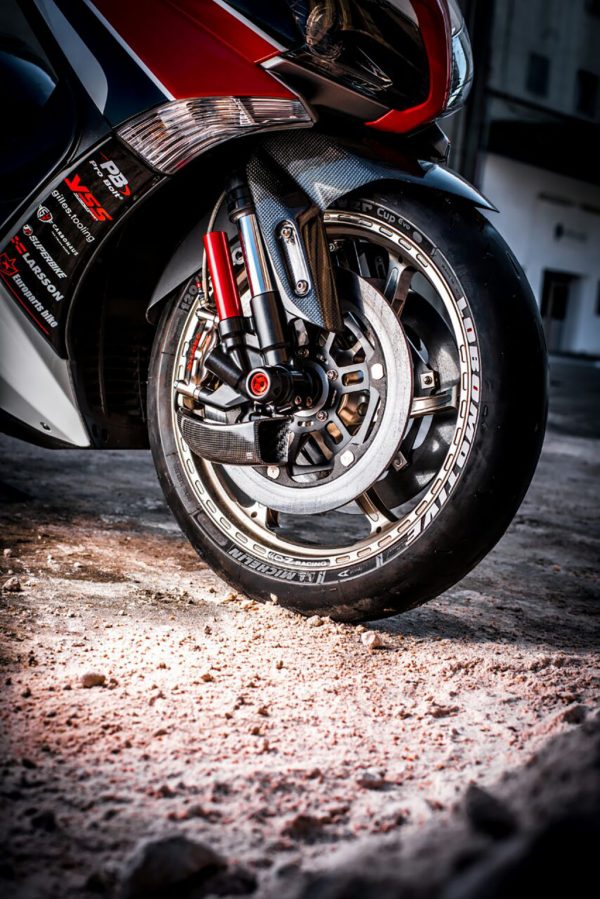 Now let’s get to the list of equipment, which is equally impressive. To give the scooter a menacing stance, Lobomotive pushed the front and rear wheel out by a further 40 mm, with some help from a set of swingarm extenders. This consequently made some room for the 17-inch magnesium alloy OZ Racing wheels and the Michelin Power Cup Evo tyres.